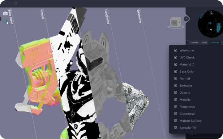 Kiwi 3D引擎为专业3D工作流程提供了简洁的界面,支持自动旋转和快速重置的360°浏览控制,使用户能够动态且精准地查看复杂模型。清晰的网格与材质列表、线框显示和双面显示功能,方便管理和调整资产,检查模型结构。