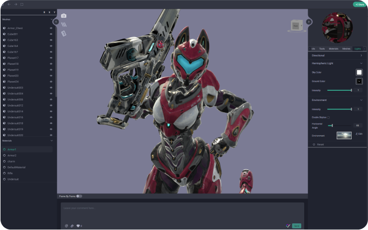ShareCreators的Kiwi 3D引擎提供简单的基于网页的3D预览,使管理者无需专用软件即可审查资产并提供反馈。